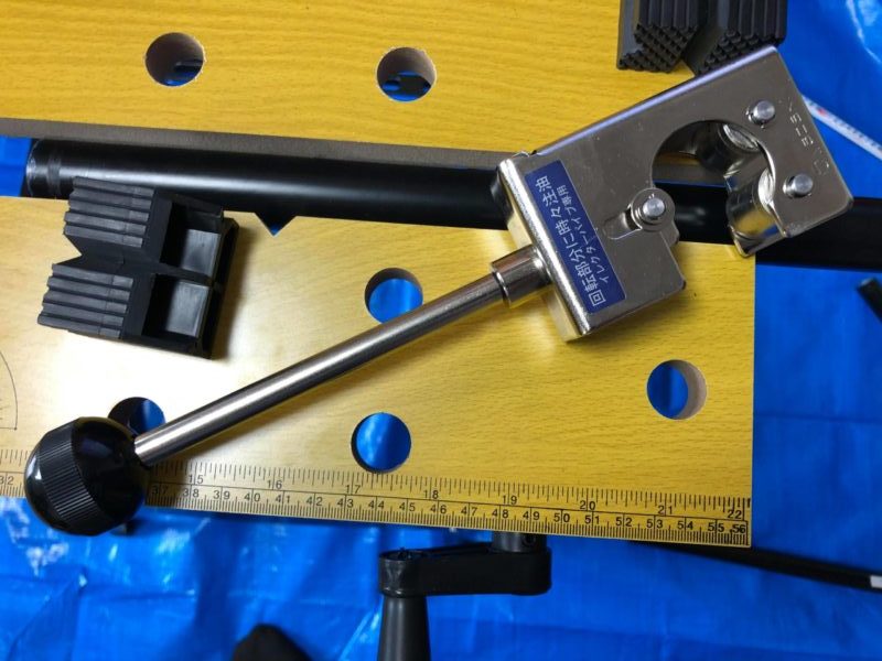 マーカーの白い点の真ん中に刃を合わせたら、ハンドルを回してきつく締めます。