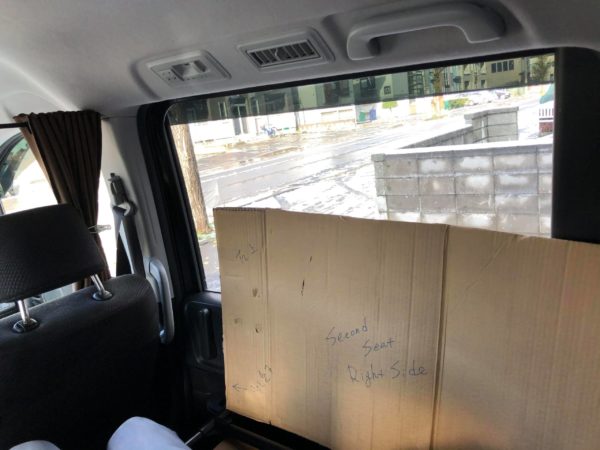 車の窓ガラスと窓枠にはスキマがあって、そこに段ボールを押し込むことでピッタリはまるように加工します。