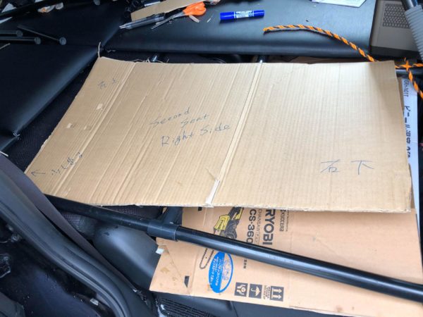 仮に車に乗せてみます。2枚の板が重なり合っていますが、車の壁に合わせて再度カットすることを計算してあります。