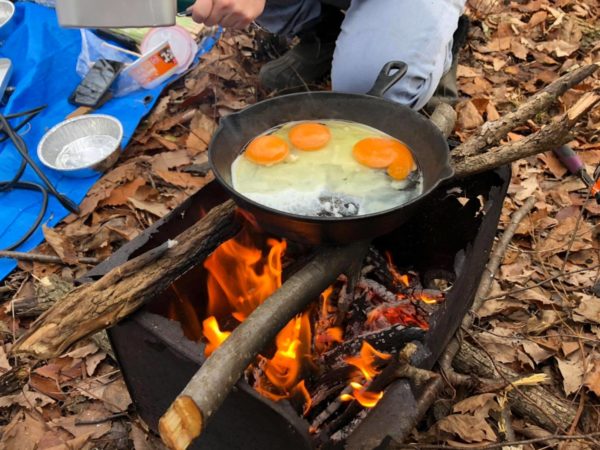 生木二本を渡してスキレットを置けるようにし、まずは目玉焼きから。