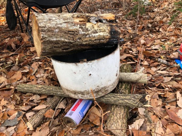 丸太を入れたのは、運よく森に落ちていた一斗缶。
