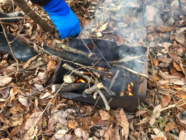 その間、先ほどの錆び落ちた一斗缶を使って焚火をスタート。