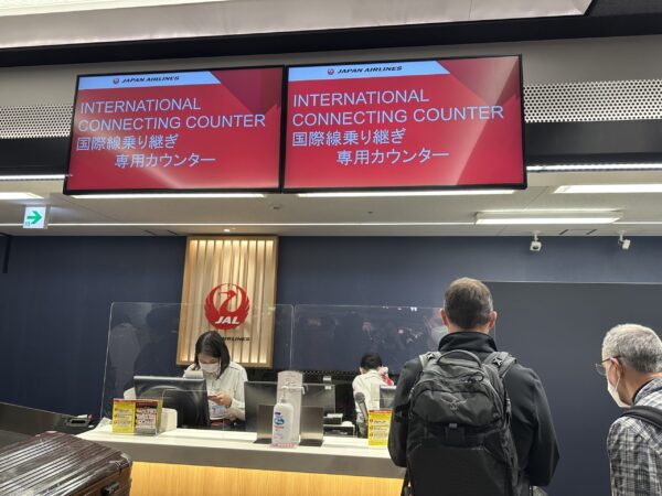 海外行きの経由便はセルフチェックインできないそうで、4番の「国際線乗り継ぎ専用カウンター」で通常のチェックインと荷物の預入をしました。