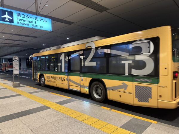 8番乗り場から無料シャトルバスが出ており、5分でターミナル3まで行くことができます。