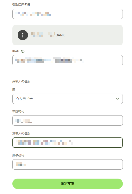 次の画面で受取人の口座名義や銀行口座情報、住所を入力します。