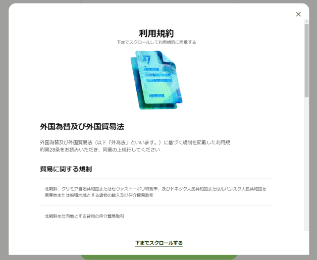 まずは、利用規約をスクロールダウンし読み進め規制に抵触しない手続きかチェックをします。