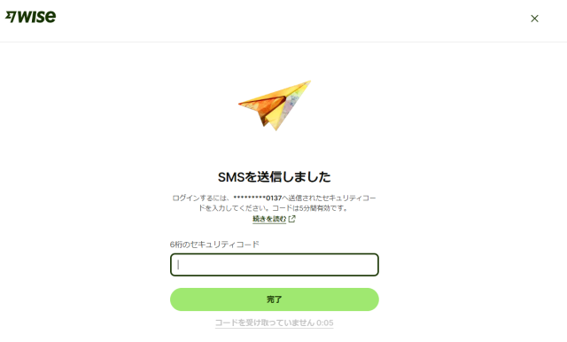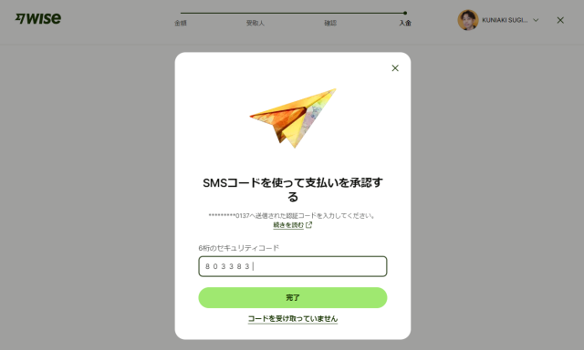 SMSのポップアップ通知が届いたら、コードを入力し「完了」を押します。