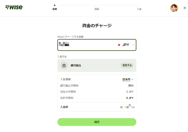 チャージしたい資金を入力して「続行」に進みます。