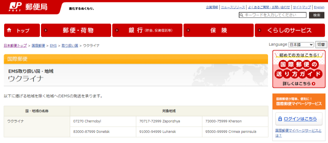 しかし、現在はウクライナ東部へ直接EMSで荷物を届けることはできません。