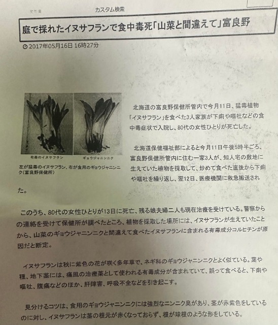 その際に、ベテランの方から行者ニンニク(アイヌネギ)と有毒植物の見分け方を教わりました。