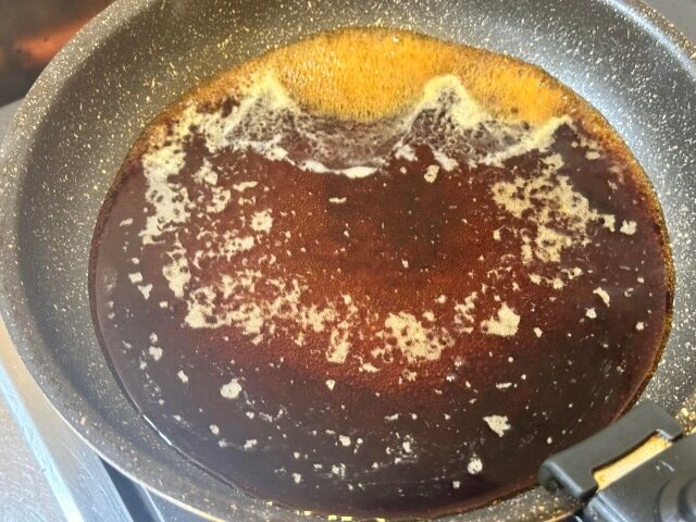 醤油(100mm)とみりん(大さじ1)、酒(大さじ2)を混ぜてフライパンで一煮立ちさせました。
