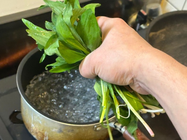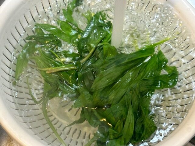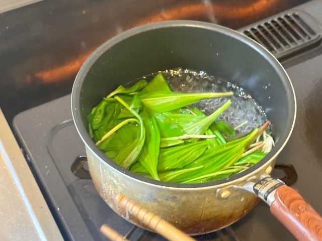行者ニンニクを入れて15秒ほどサッと茹でます。