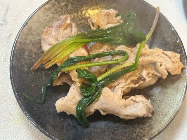 簡単に塩コショウを振って焼いた豚肉に行者ニンニクを添えてみました。