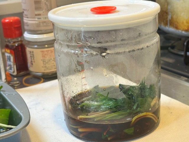 調味液に行者ニンニクを漬けて冷蔵庫で寝かせれば完成です。