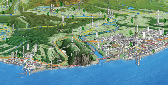 鳥観図からわかるように、町の主要な機能がコンパクトにまとまっているので町の中の移動が便利です。