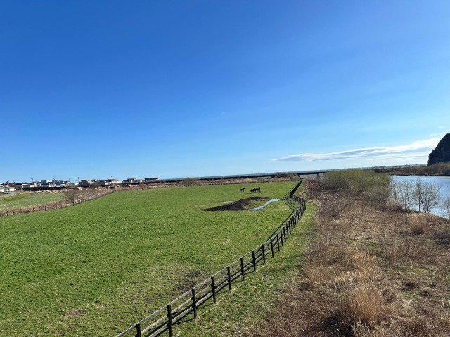 その橋の上から見えるのがこの広い牧場です。
