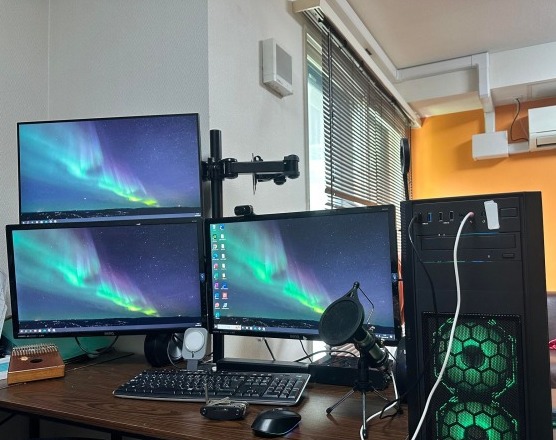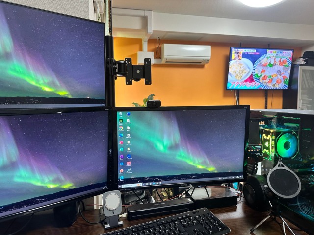 トリプルディスプレイ+壁掛けテレビという快適作業環境で効率UPできそうです。