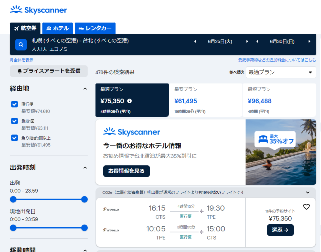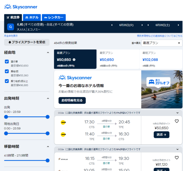リダイレクトが終わると、スカイスキャナーで検索した日程のフライトが表示されています。