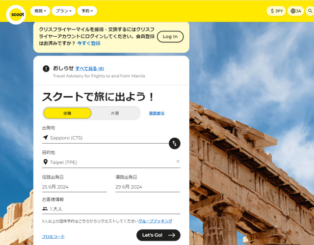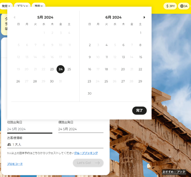 出発地と目的地、往路出発日、復路出発日を選択し「Let's Go!」をクリックします。
