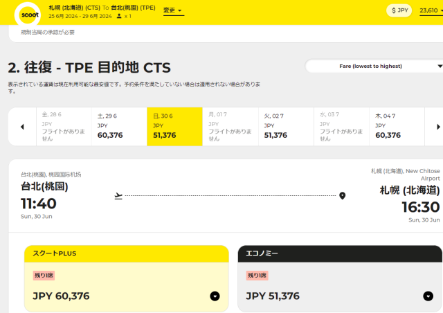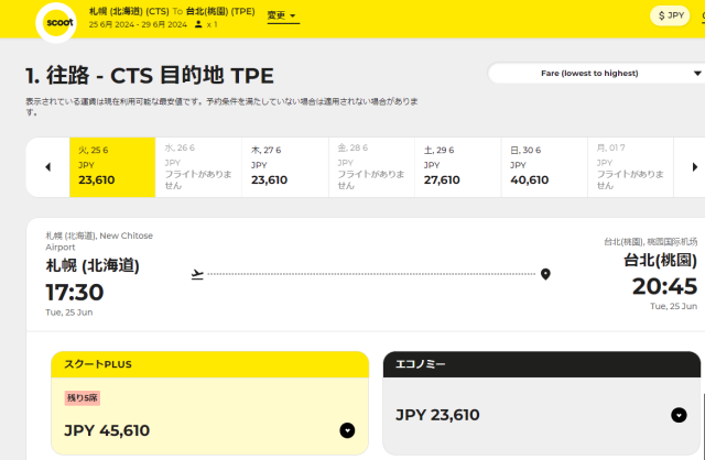 SCOOTの検索結果、6月25日往路出発-6月30日復路出発に合わせて再検索しました。