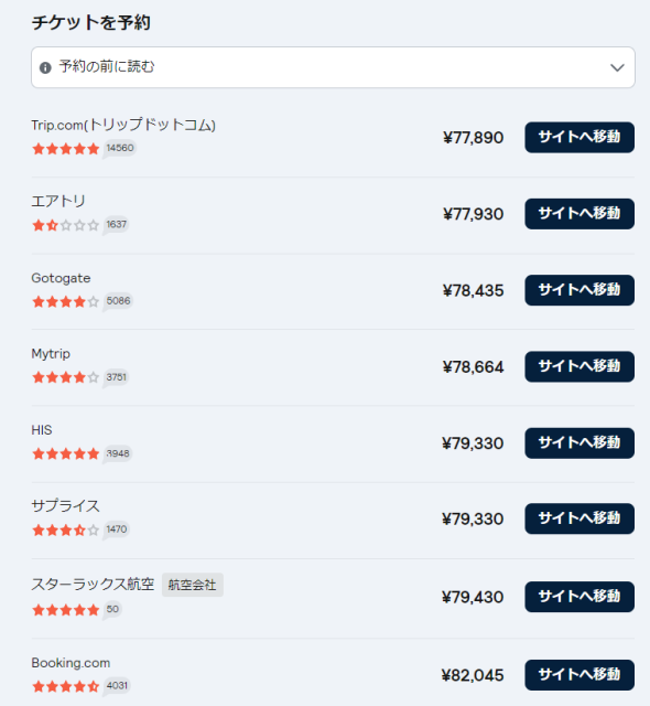 価格が安い順に旅行会社や航空会社が表示されました。