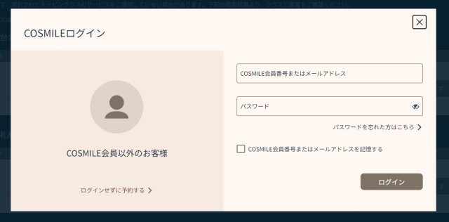 COSMILE会員ではないので、「ログインせずに予約する」をクリックしました。