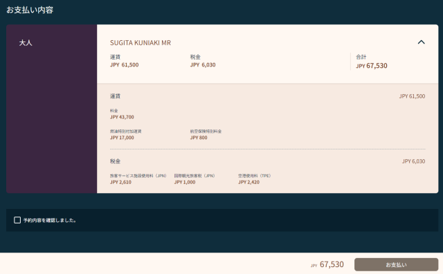 航空券検索画面で表示されていた合計金額67,530円から変わっていないことが確認できますね。