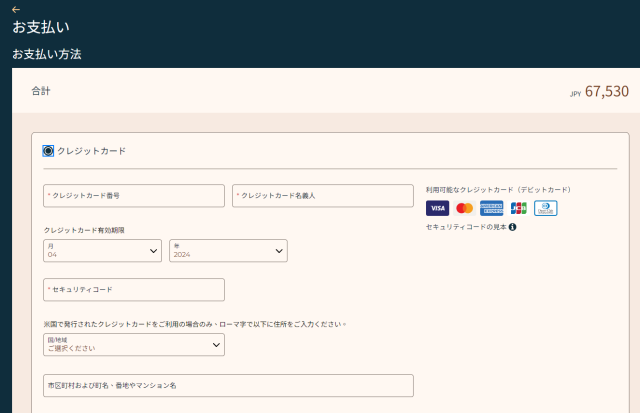 画面下部は米国で発行されたクレジットカードをご利用の場合のみ、ローマ字で住所を入力とあります。