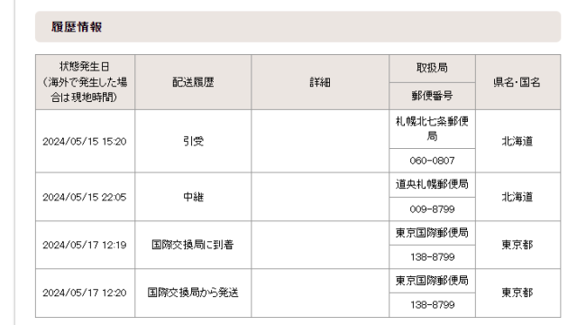 日本郵便の追跡を確認すると、おそらく5月31日か6月頭に第3便目が現地に届くと考えられます。