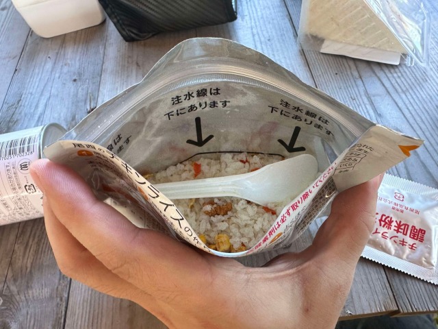 お湯または水を入れて15分後には食べられる、ありがたい非常食がアルファ米です。
