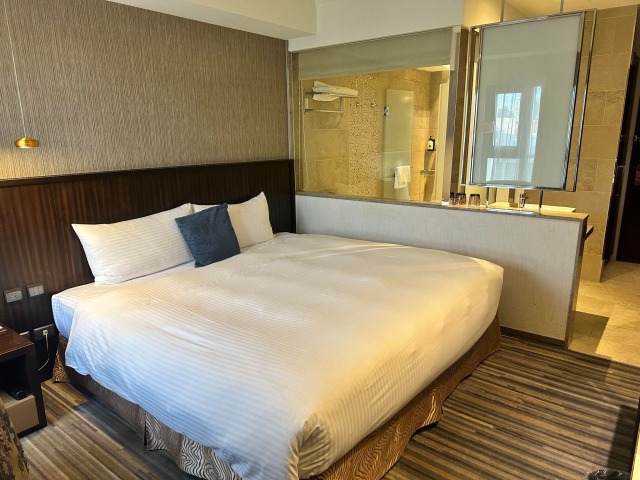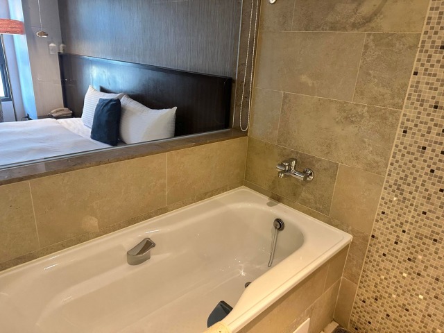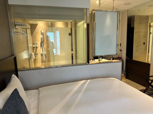 バスタブの奥にベッドが見えますが、ガラスの窓があるのでもちろん水が飛ぶことはありません。