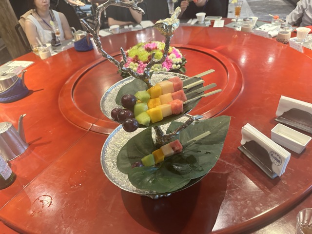 食後にはアフタヌーンティーのように飾られたフルーツを串に刺したものが提供されました。