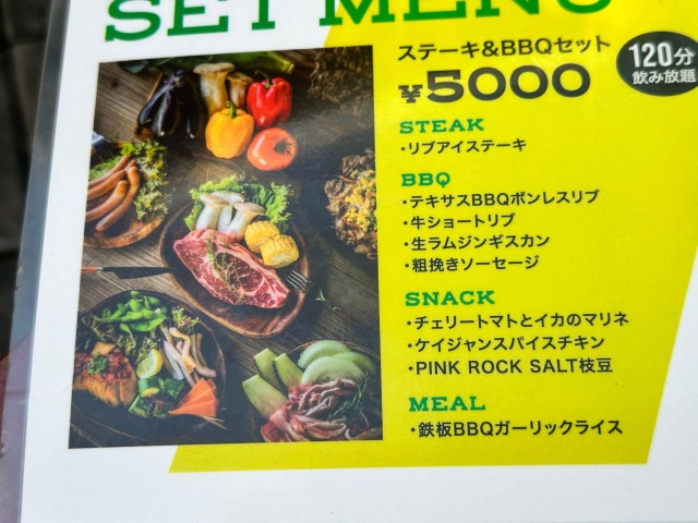 | ステーキ&BBQセット(120分飲み放題) | 5000円 |