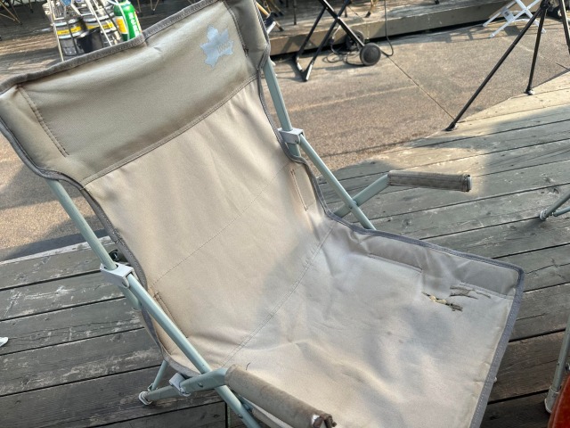 キャンプ用の椅子にはダメージを補修した跡がありました。