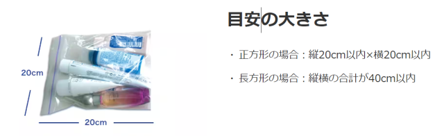 - プラスチック袋は縦横の合計が20cm以内であり、スライダー付きであること