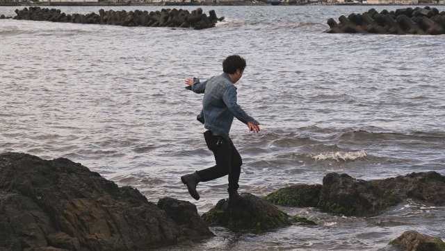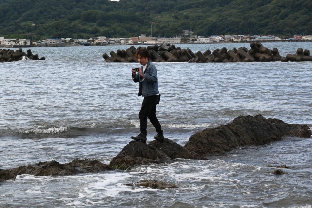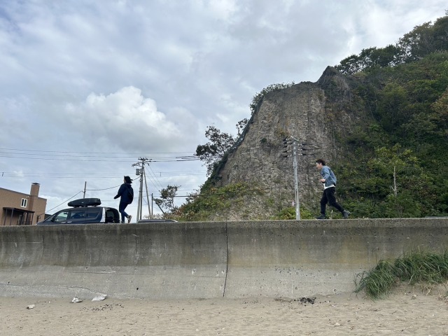 波打ち際に大き目の岩があって、波が引いたときに乗ることができます。