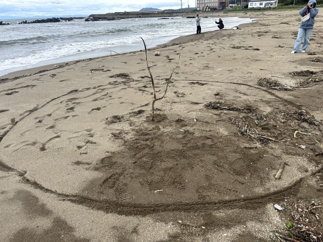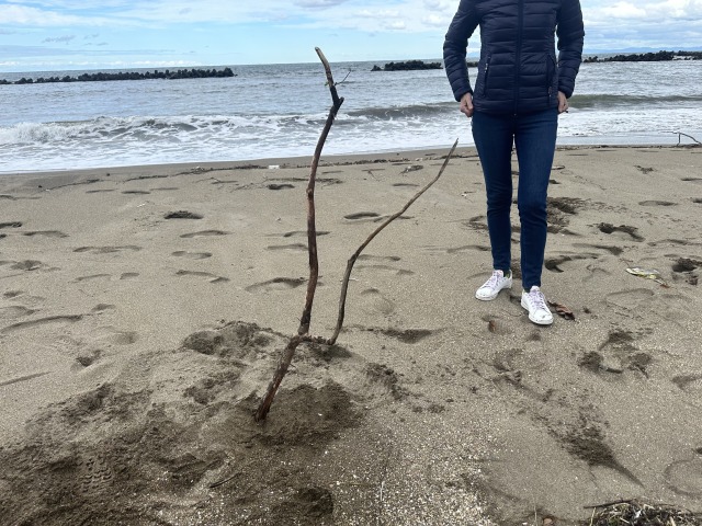 浜に落ちていた大きな枝を牛の角に見立てて少し遊びました。