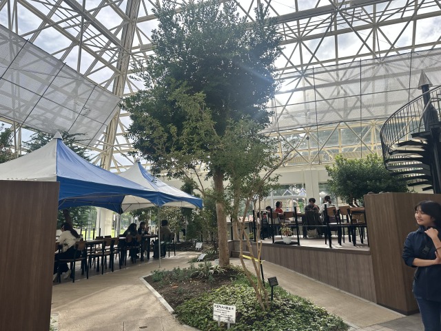 ガラス屋根のピラミッド施設の中は飲食をしたりお手洗いを利用できる休憩所になっていました。