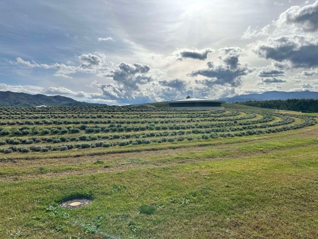 ラベンダーの丘の向こうの施設の上にちょこんと見えている丸いものがあります。