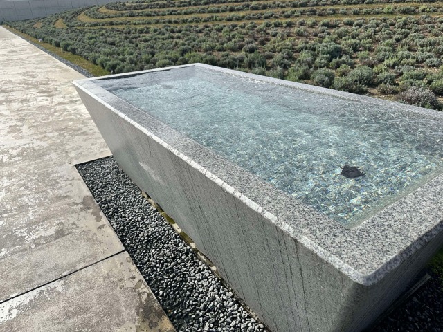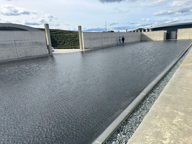 こちらはプールではなく、浅く水を張った「堀」を思わせるオブジェです。
