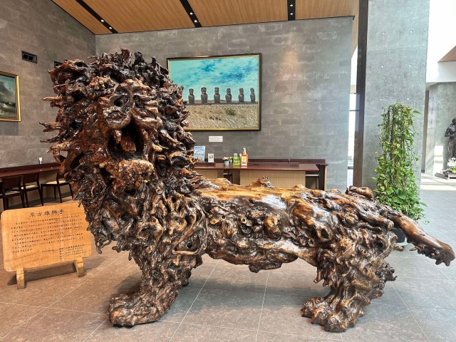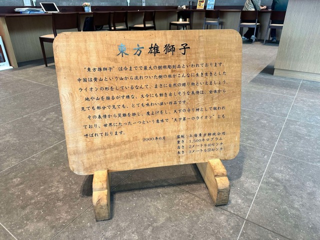 東方雄獅子は今までで最大の樹根彫刻品といわれております。 中国は黄山という山から流れついた樹の根がこんなに生き生きとしたライオンの形をしているなんて、まさに自然の贈り物といえましょう。 地や山を揺るがす様な、又今にも動き出しそうな表情は、全体から見ても部分で見ても、とても味わい深い作品です。 その表情から災難を排し、魔よけをし、天下の守り神として敬われており、世界にたった一つという意味で“天下第一のライオン”とも呼ばれております。2000年6月 監制 :上海東方郵政公司 重さ:1,500キログラム 高さ:2メートル40センチ 長さ:3メートル50センチ