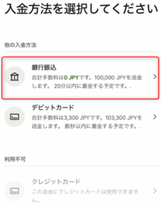 デビットカードからの入金は手数料が3,300円と高い一方、銀行振込は手数料無料なので銀行振込を選ぶようにしましょう。