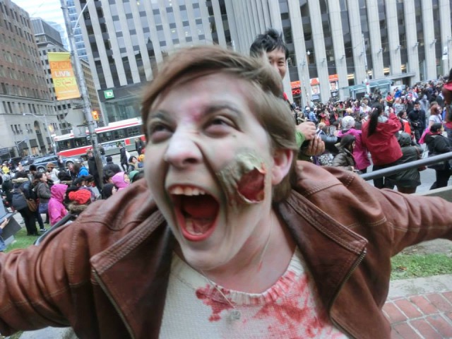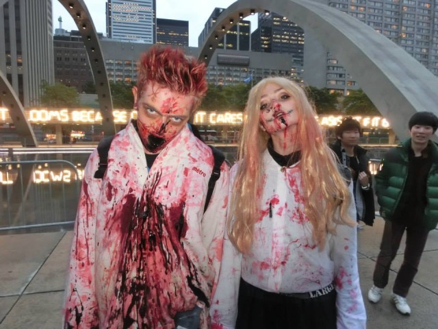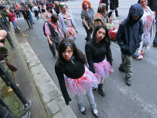 姉妹か双子か、どんな年齢でも妥協ない仮装や演技をするのがカナダのゾンビウォークです。