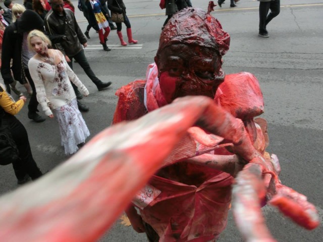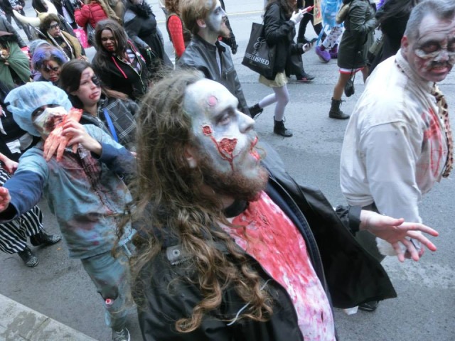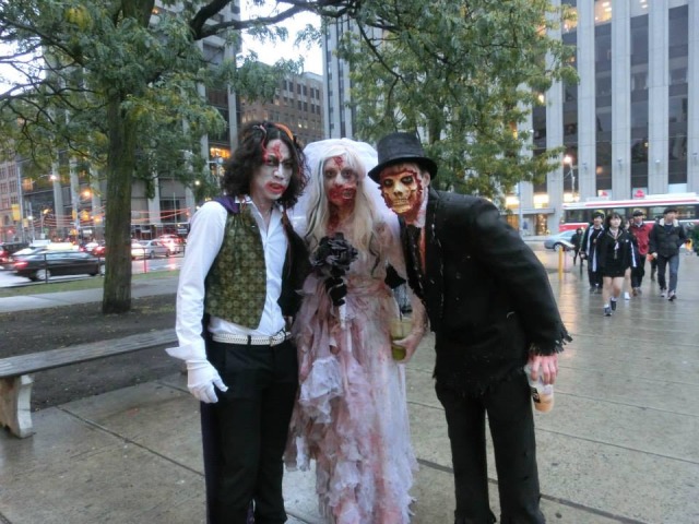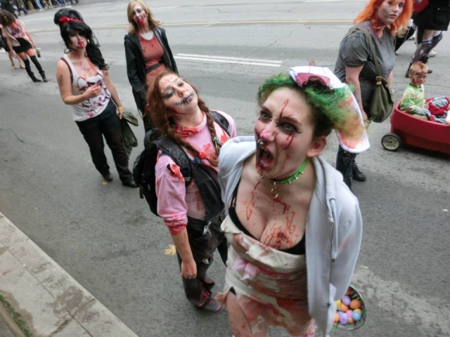 かなり手の込んだ...特殊メイクレベルの仮装をして街を歩くゾンビウォークが有名です。