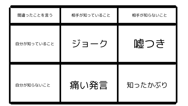 相手がどこまでわかっているか知らずにジョークを言おうとして変な感じになるのはこの表で説明ができると思います。