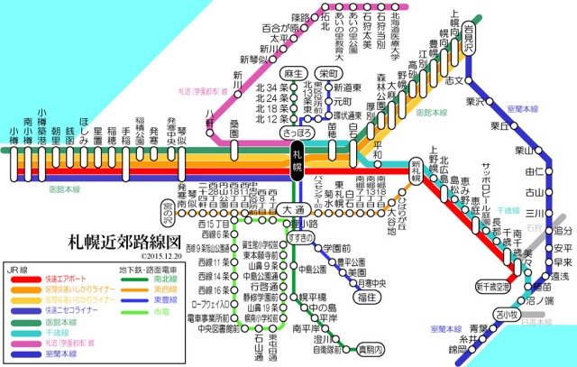 上の路線図では左下ライムグリーンの環状になっているのが札幌市電です。
