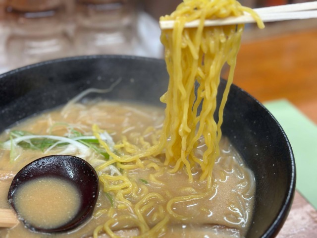 麺は小林製麺の中太ちぢれ卵麺は表面ツルツルで中がモチモチしています。
