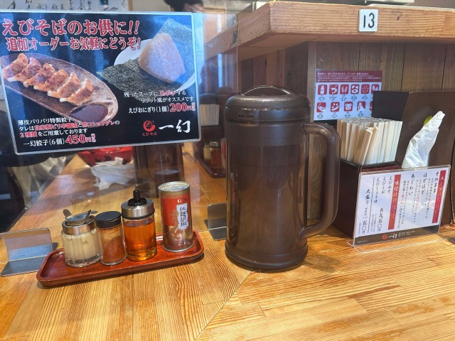 カウンター席にはコショウ、ラー油、一味、すりおろしにんにくなどが並んでいます。