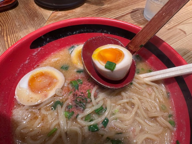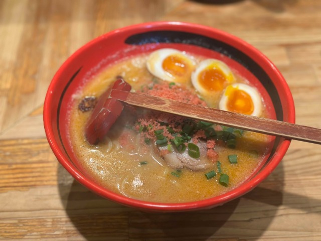 赤が目を引く器と、散りばめられた薬味が他のラーメンとの違いですね。