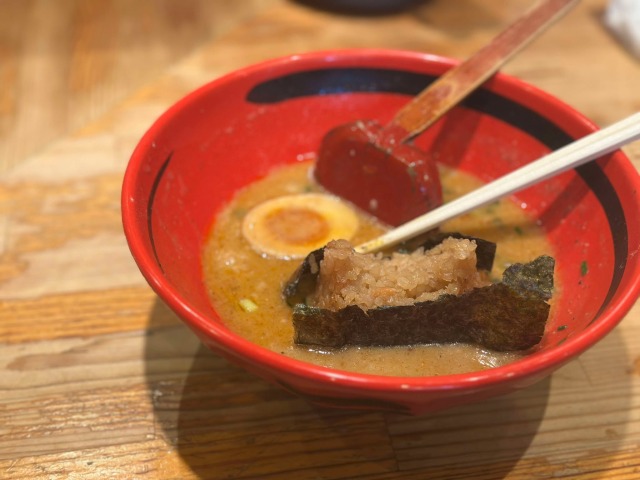 背油が浮いているまろみがありつつ、味はしっかり濃いめ。